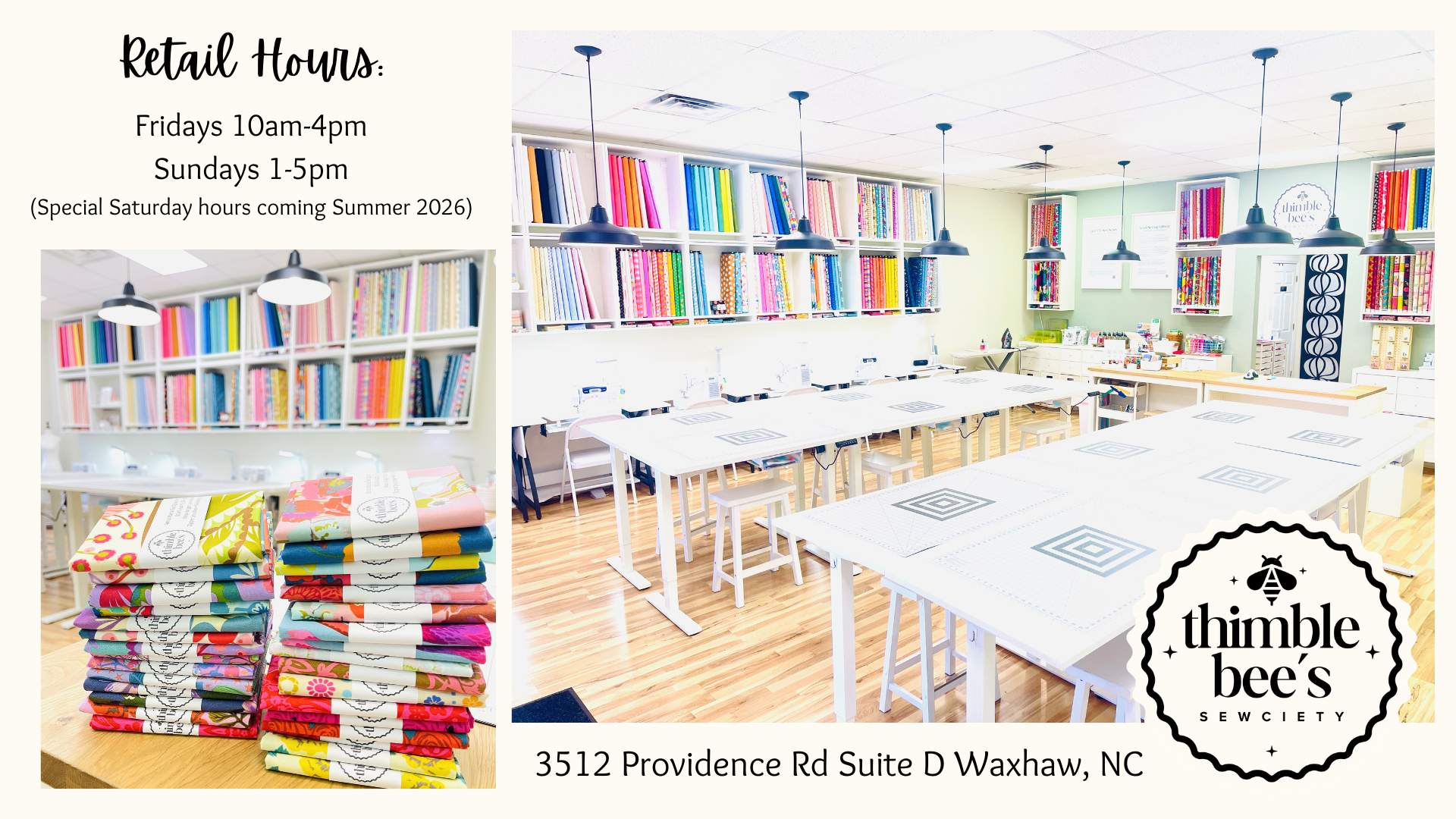 If you prefer shopping online, you can visit our Etsy shop here: Thimble Bee’s Sewciety Fabric Shop